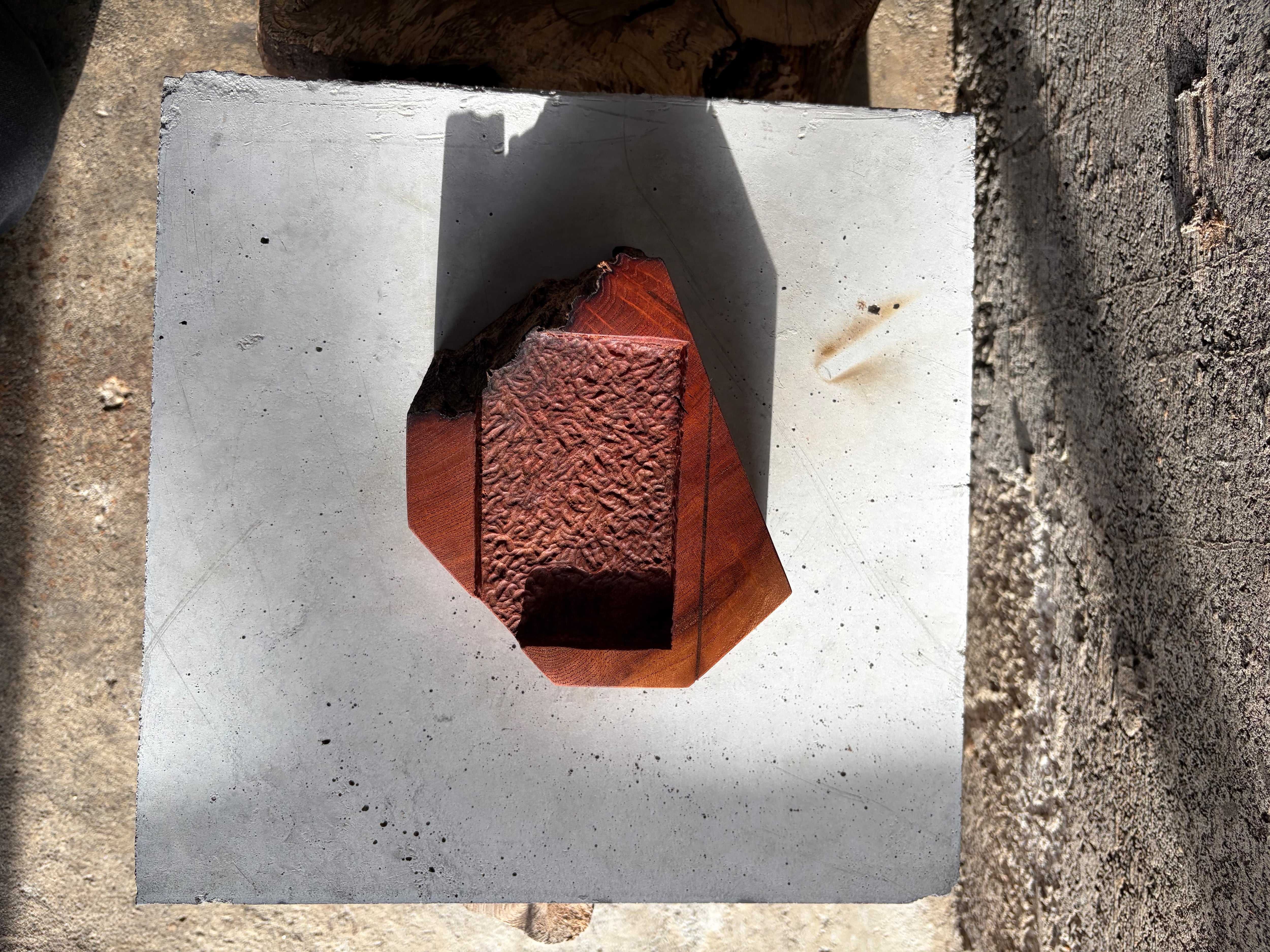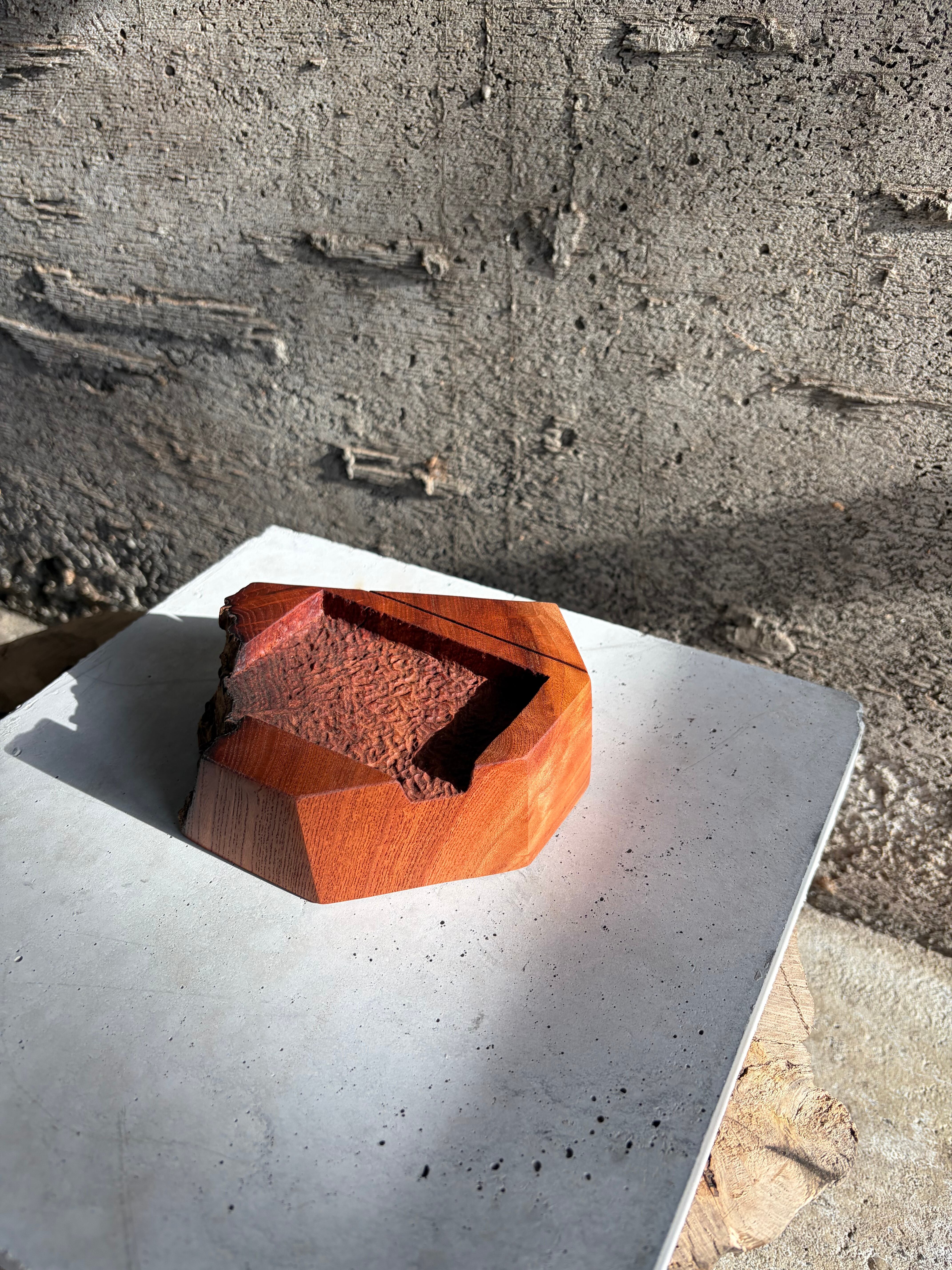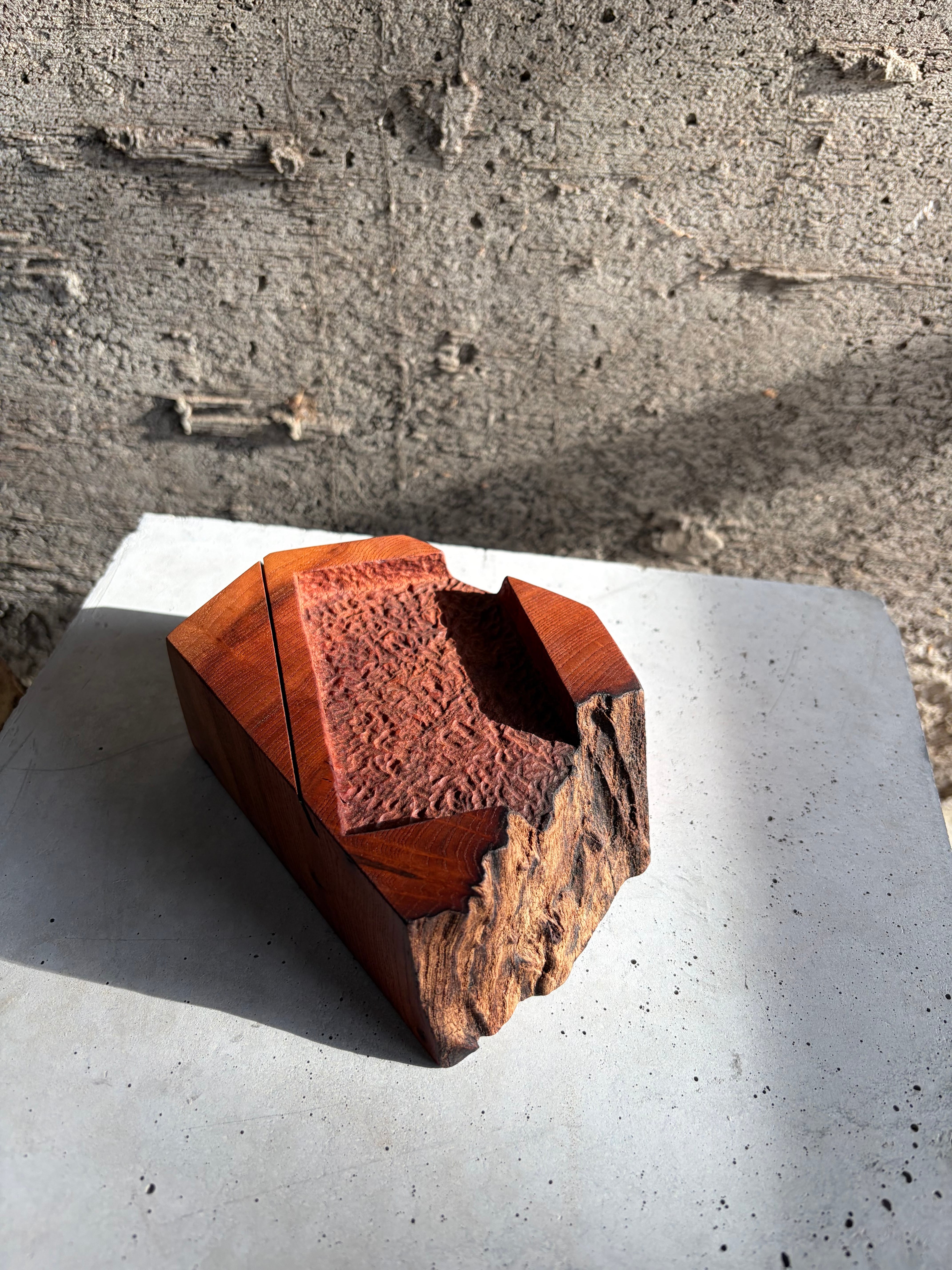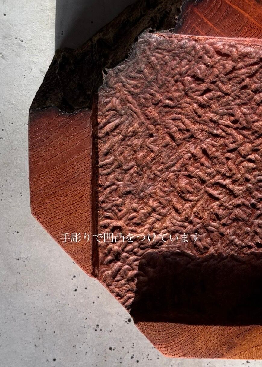 素材には推定樹齢350年を超える紅欅の心材を採用しています。高樹齢の欅がもつ独特の油分と風合い、そして本材の非常に高い密度により磨いた表面は宝石のように滑らかに。