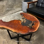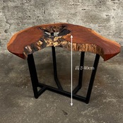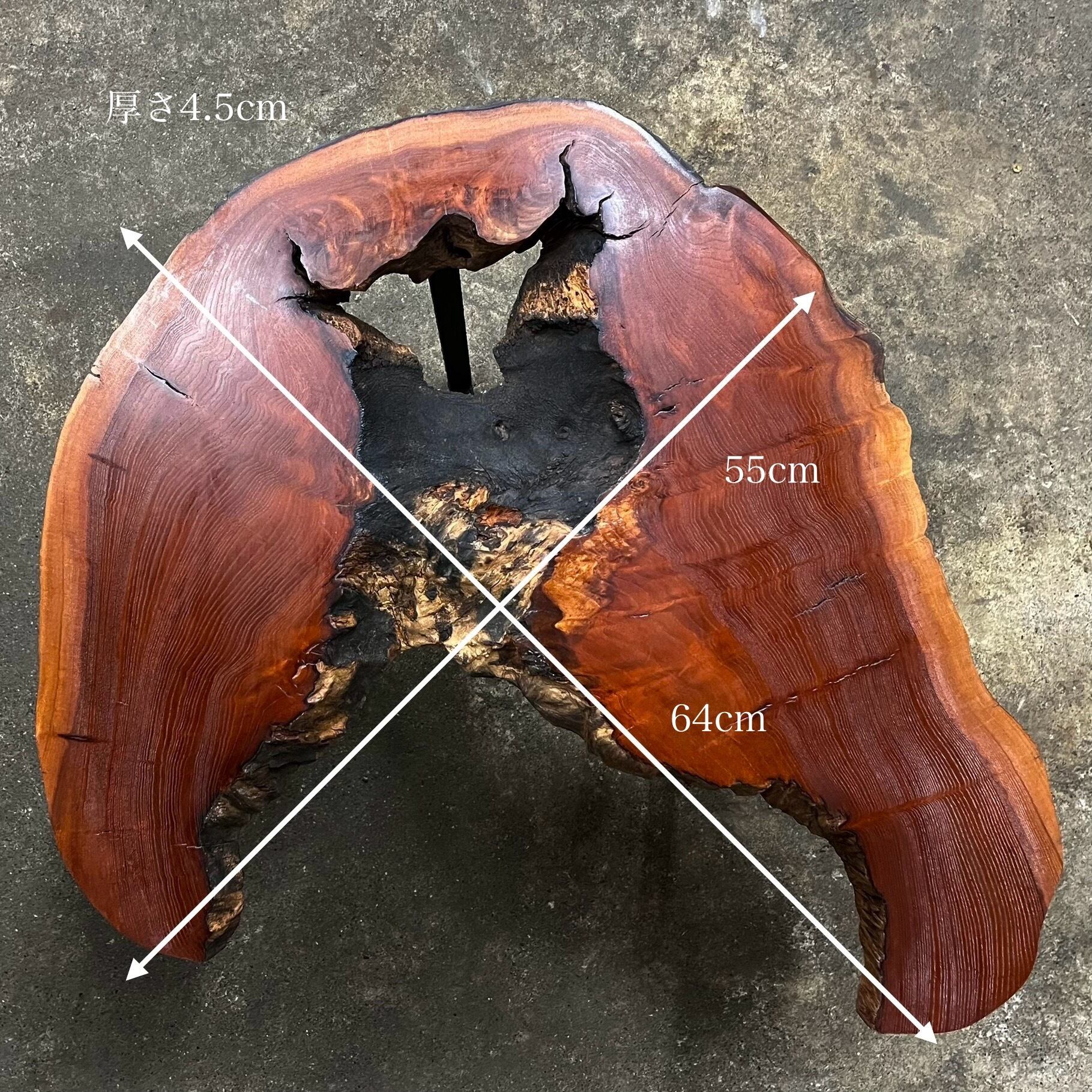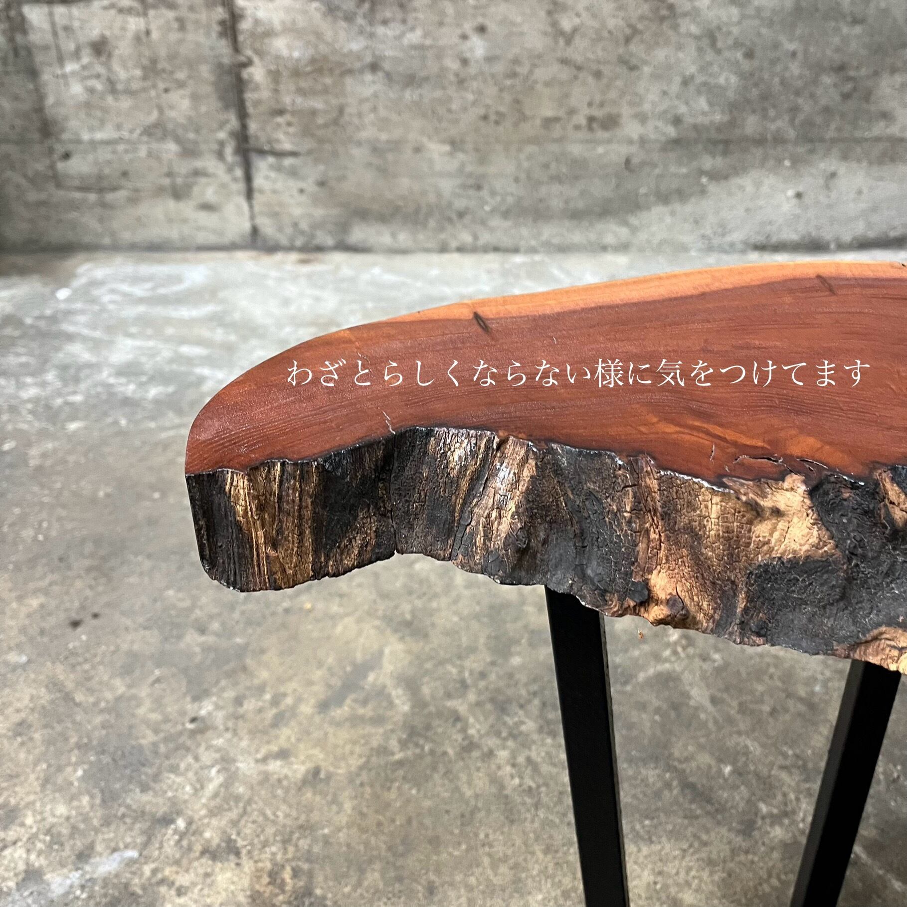 銘木一枚板の常識的には樹皮を剥ぎ取る加工が一般的ですが、作者の価値観により意図的に樹皮部分の加工を最小限に留めています。その上で必要な防汚措置を施していますが不自然にならない様にあえて残してある凹凸などがあります。取り扱いにはご注意ください。
