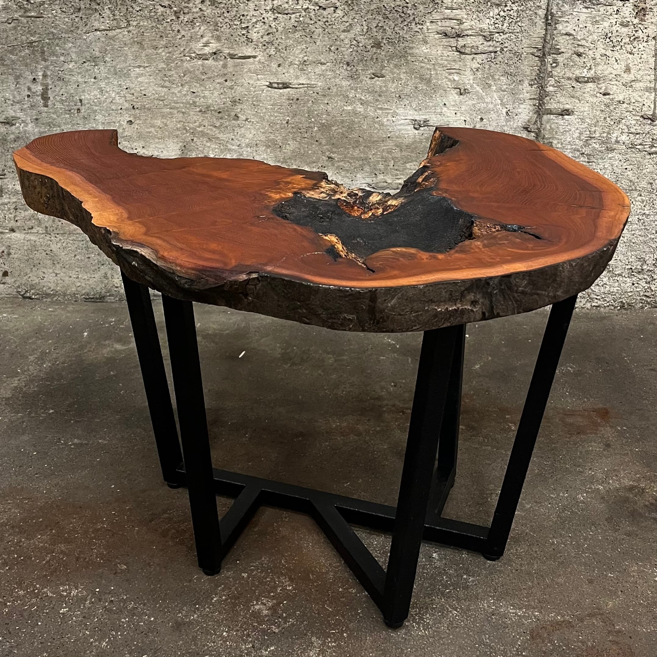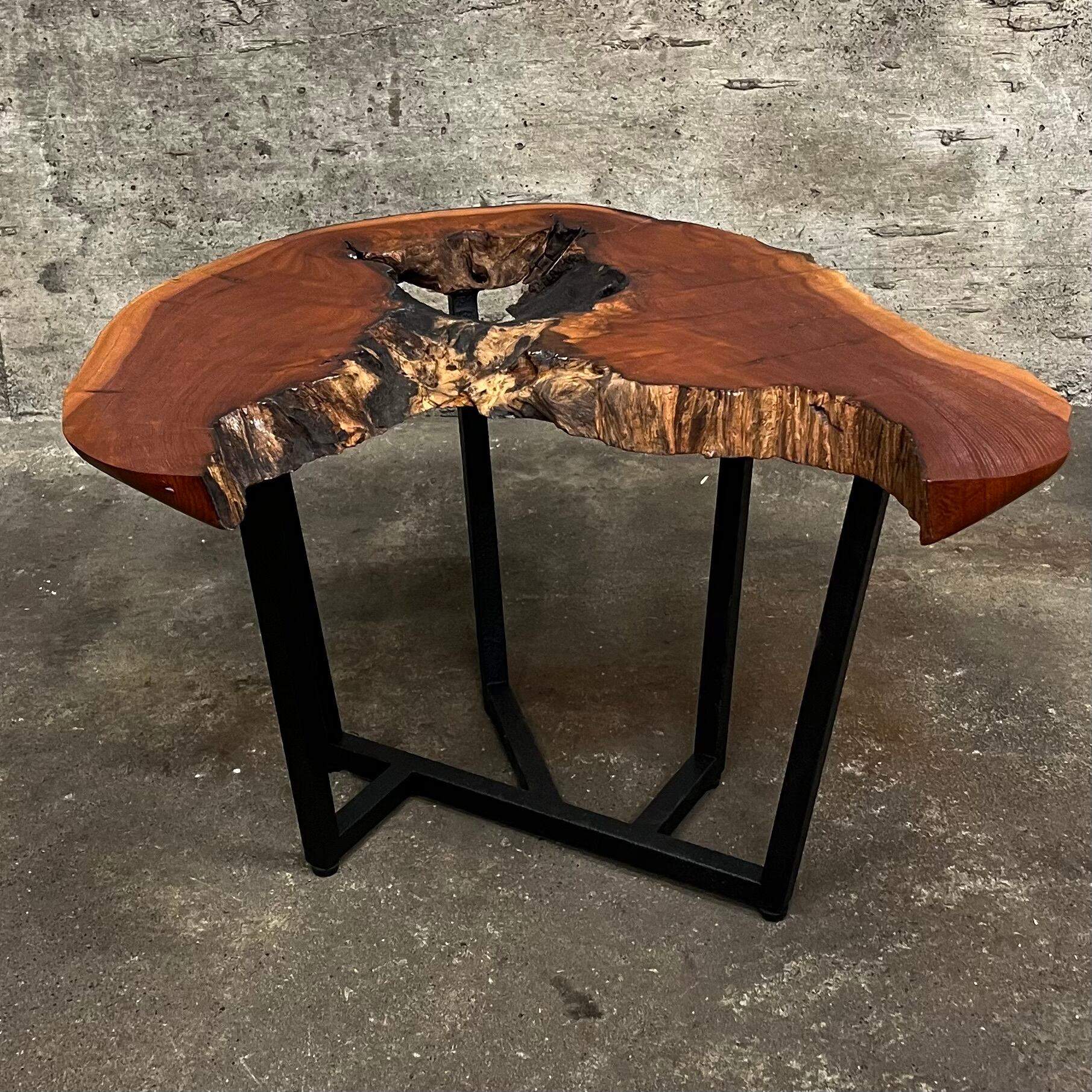 ワインレッドの芯材はとても綺麗で材としての硬度も充分、緻密に目が詰まっている感じです。本作では天板部と空洞だった部分のコントラストを大切に製作に取り組みました。無塗装の様に見える部分にも、浸透性セラミック塗料(tatara撥水セラミックマルチ)でしっかり防汚性能を持たせてあります。