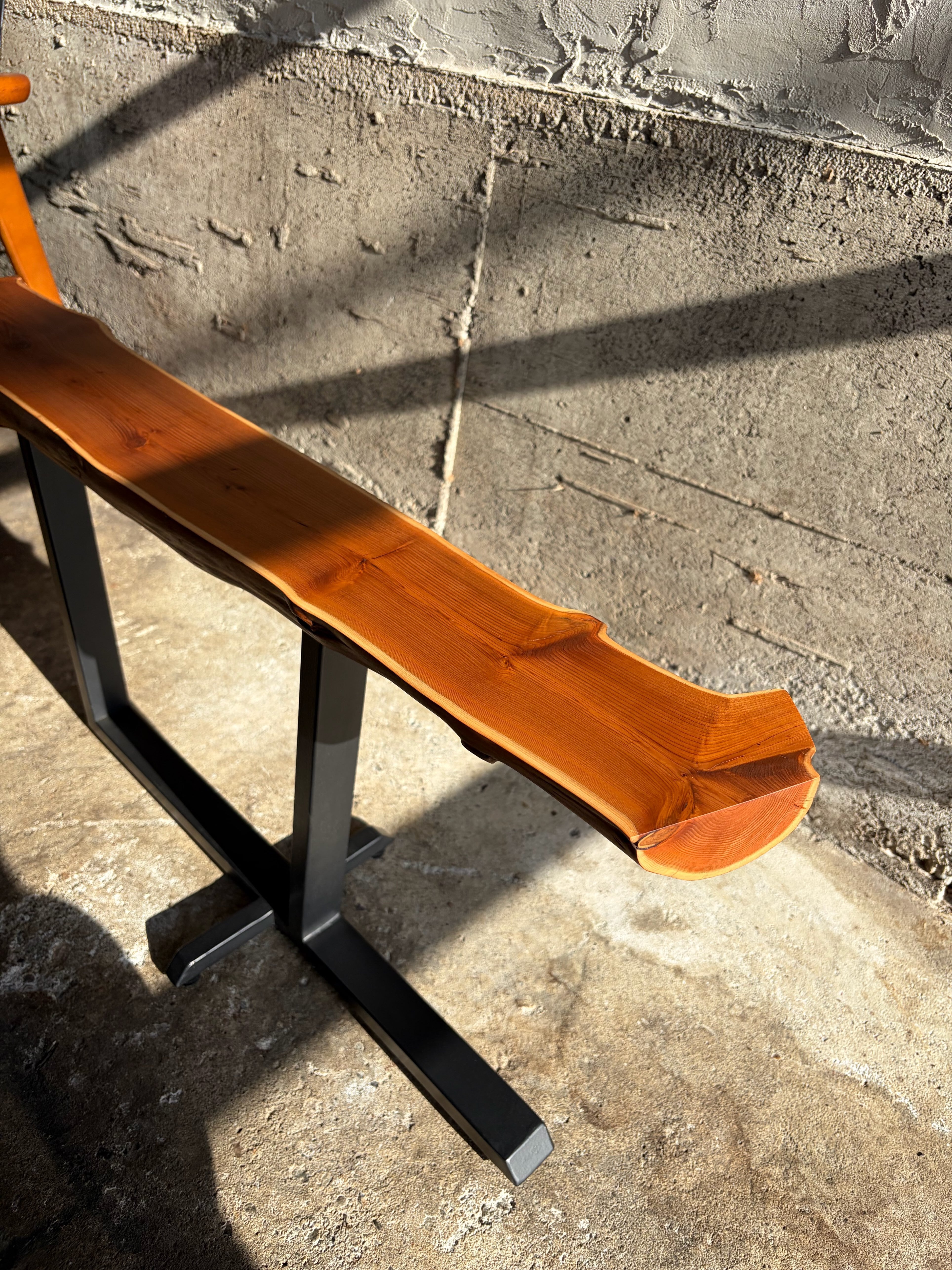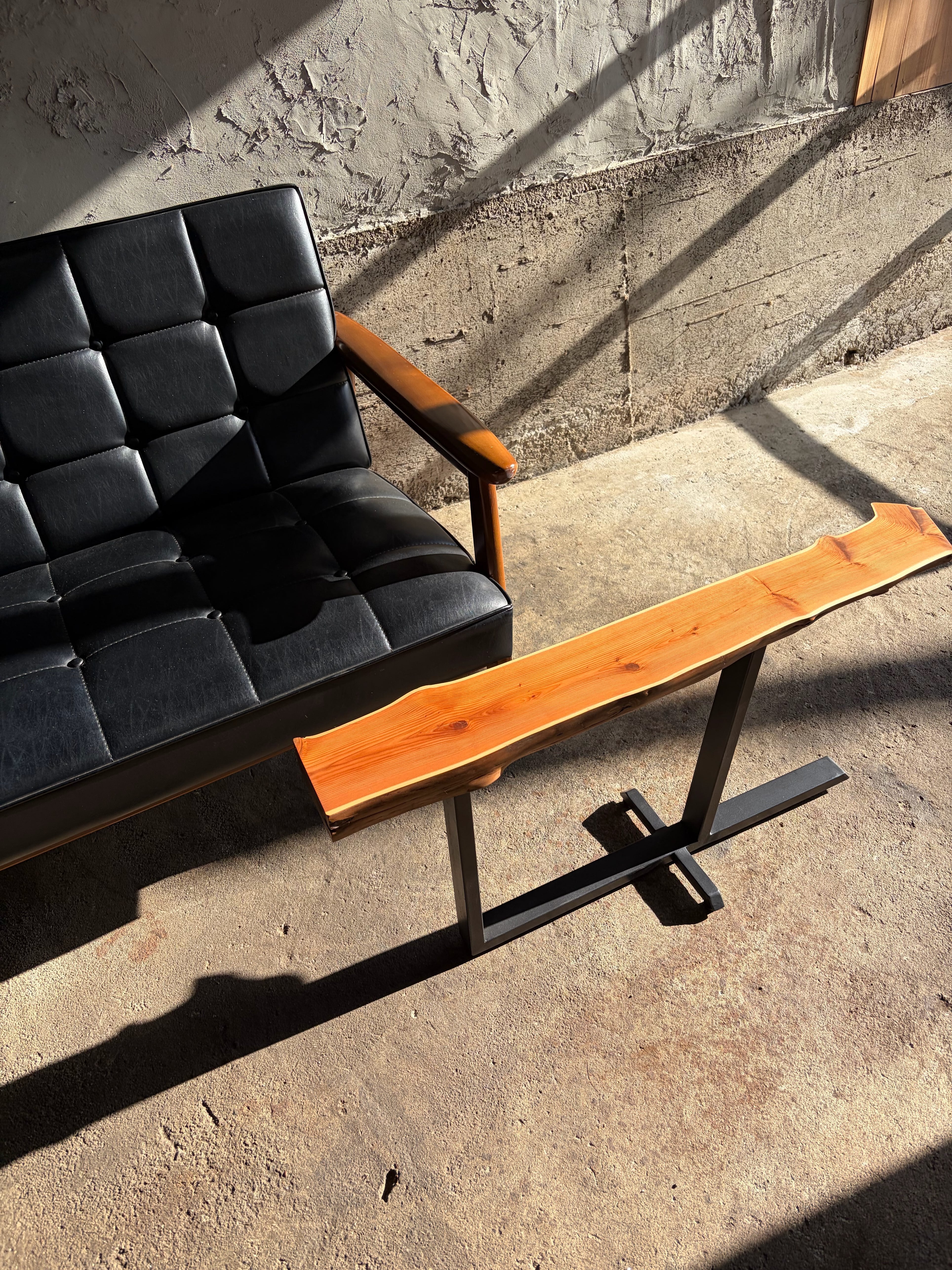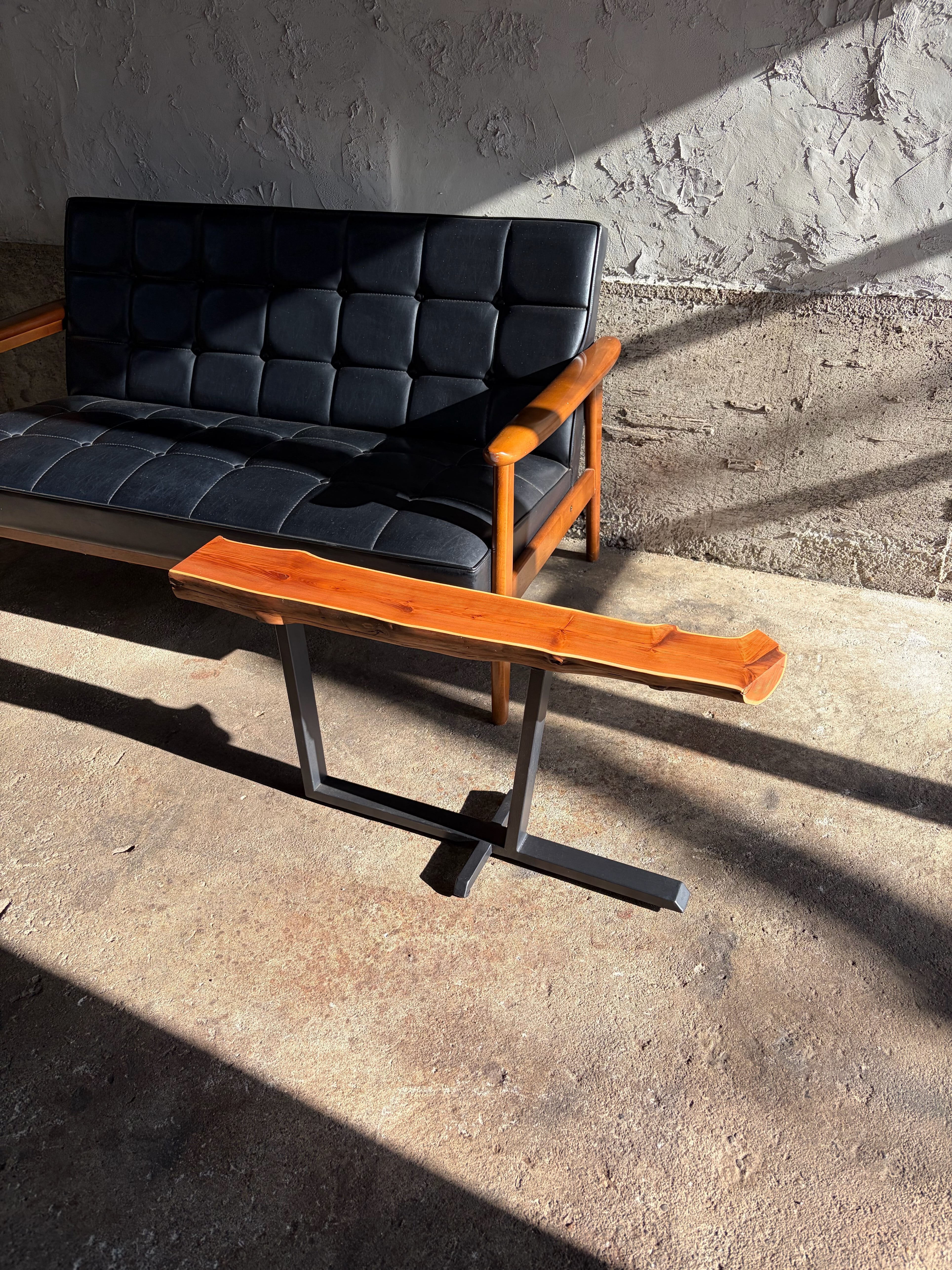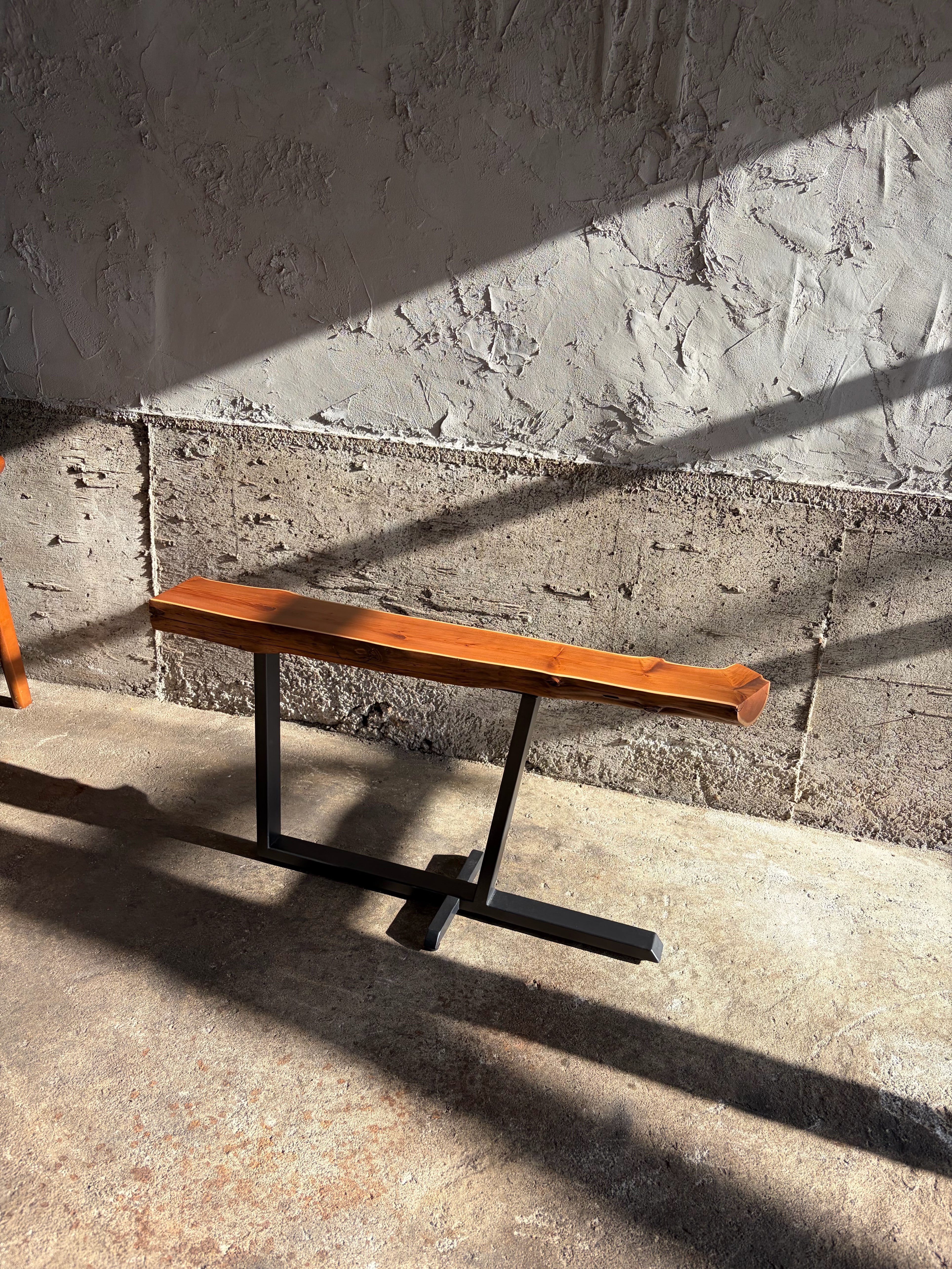 本作では天板に敢えて木の姿を残し左右非対称な鉄脚を合わせました。既製品には無い個性を持ち、同時に機能的な品物を作るよう心がけています。