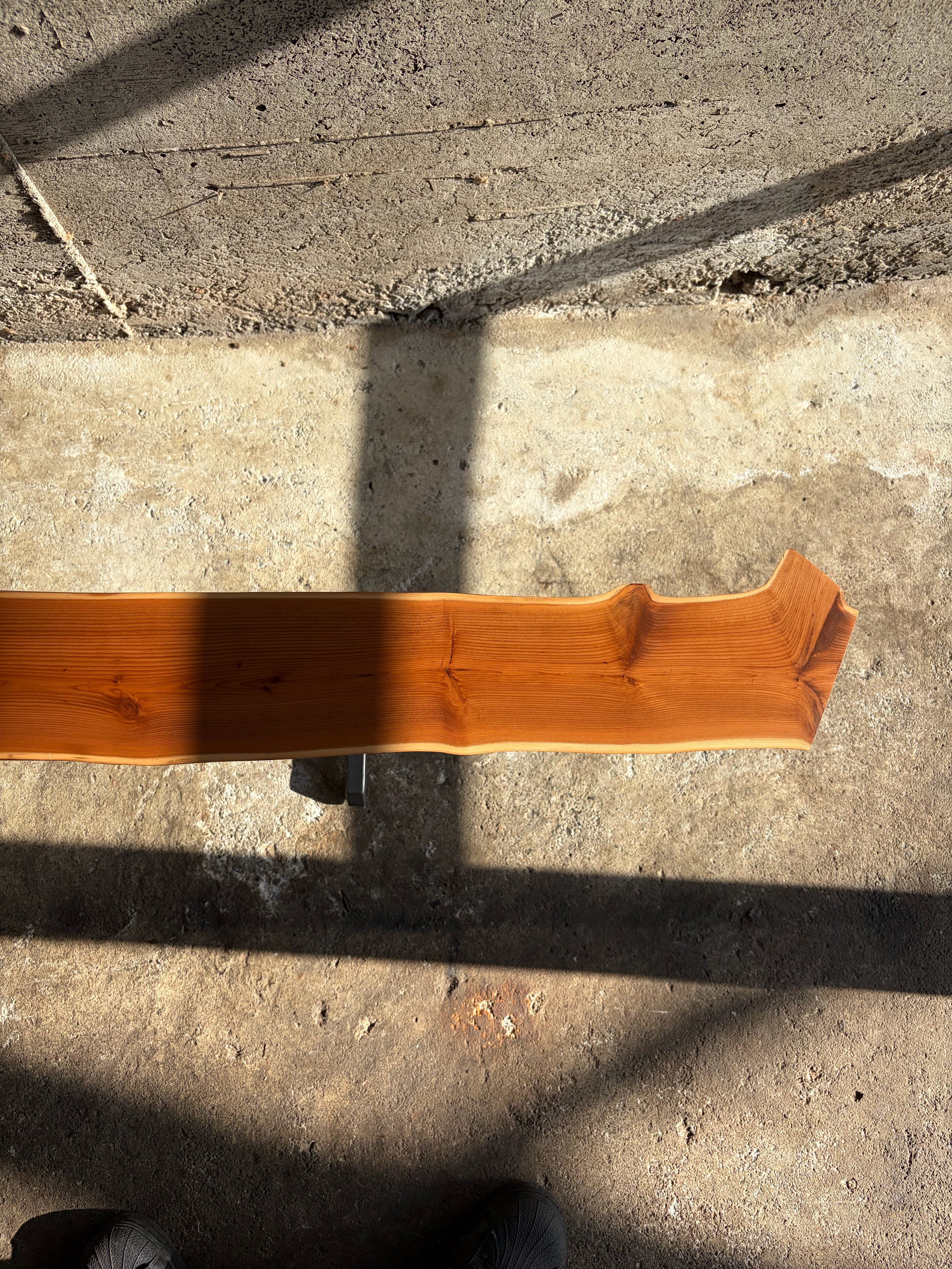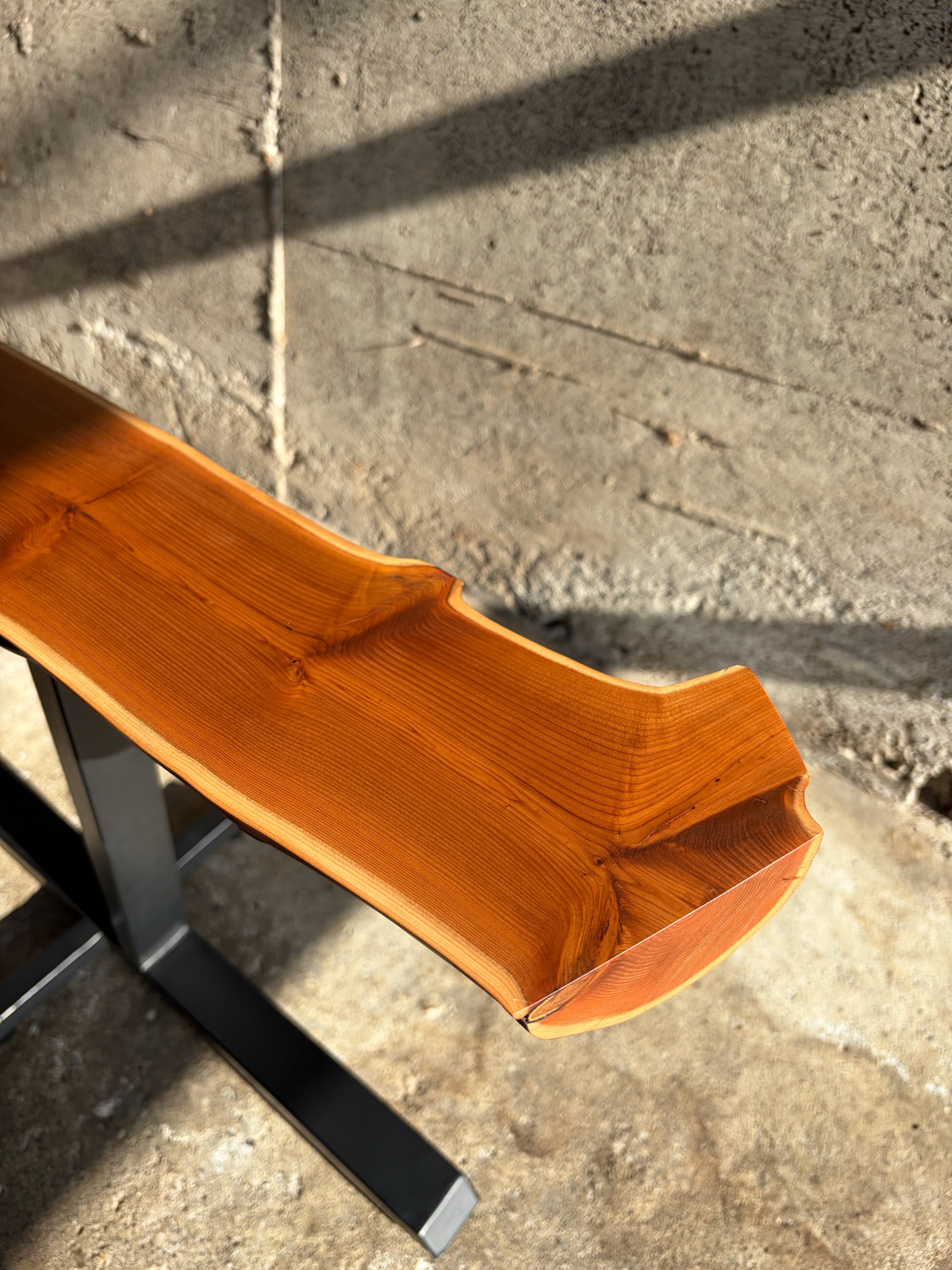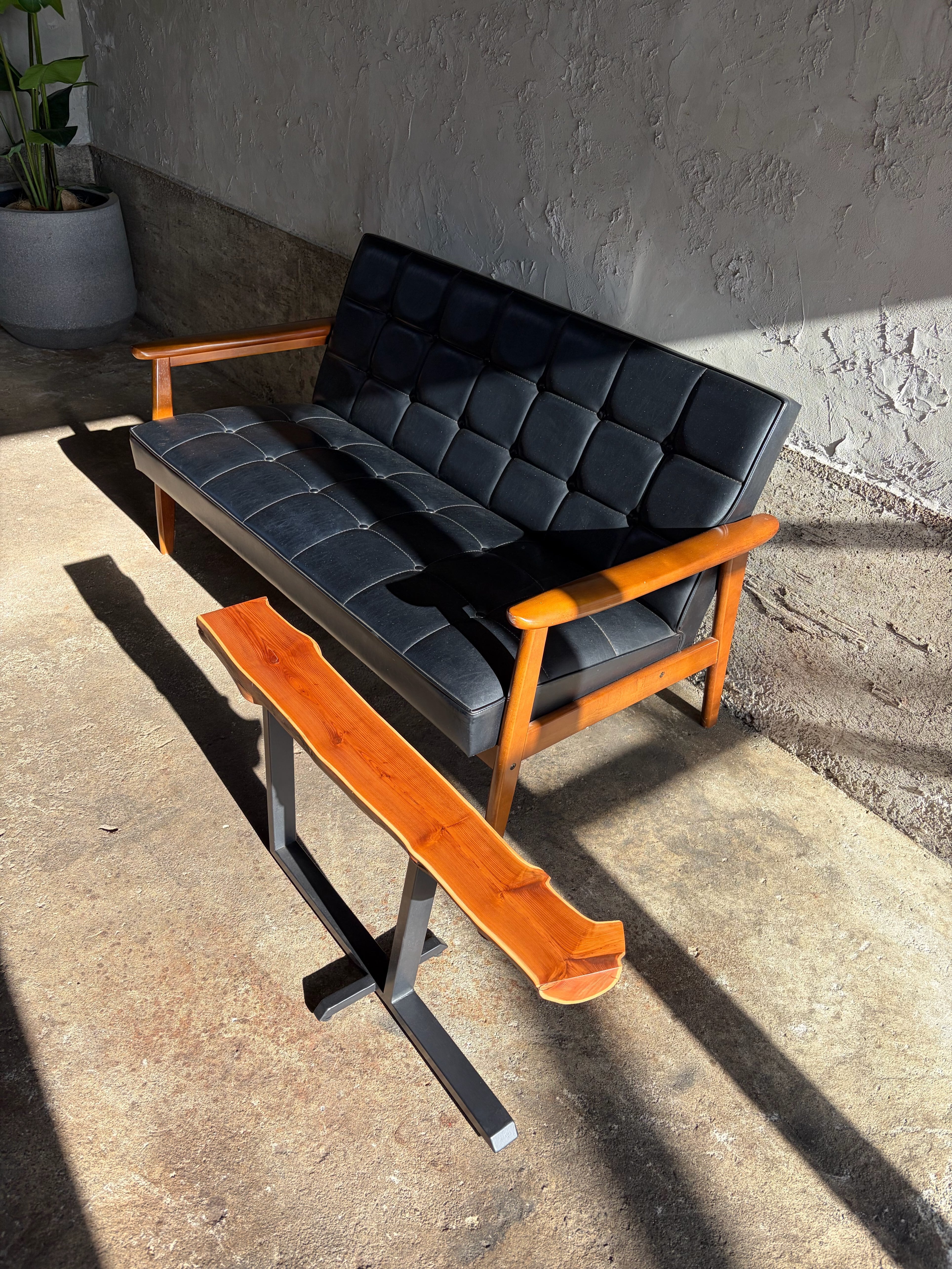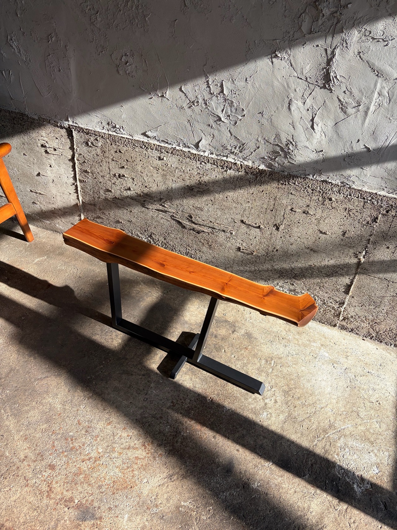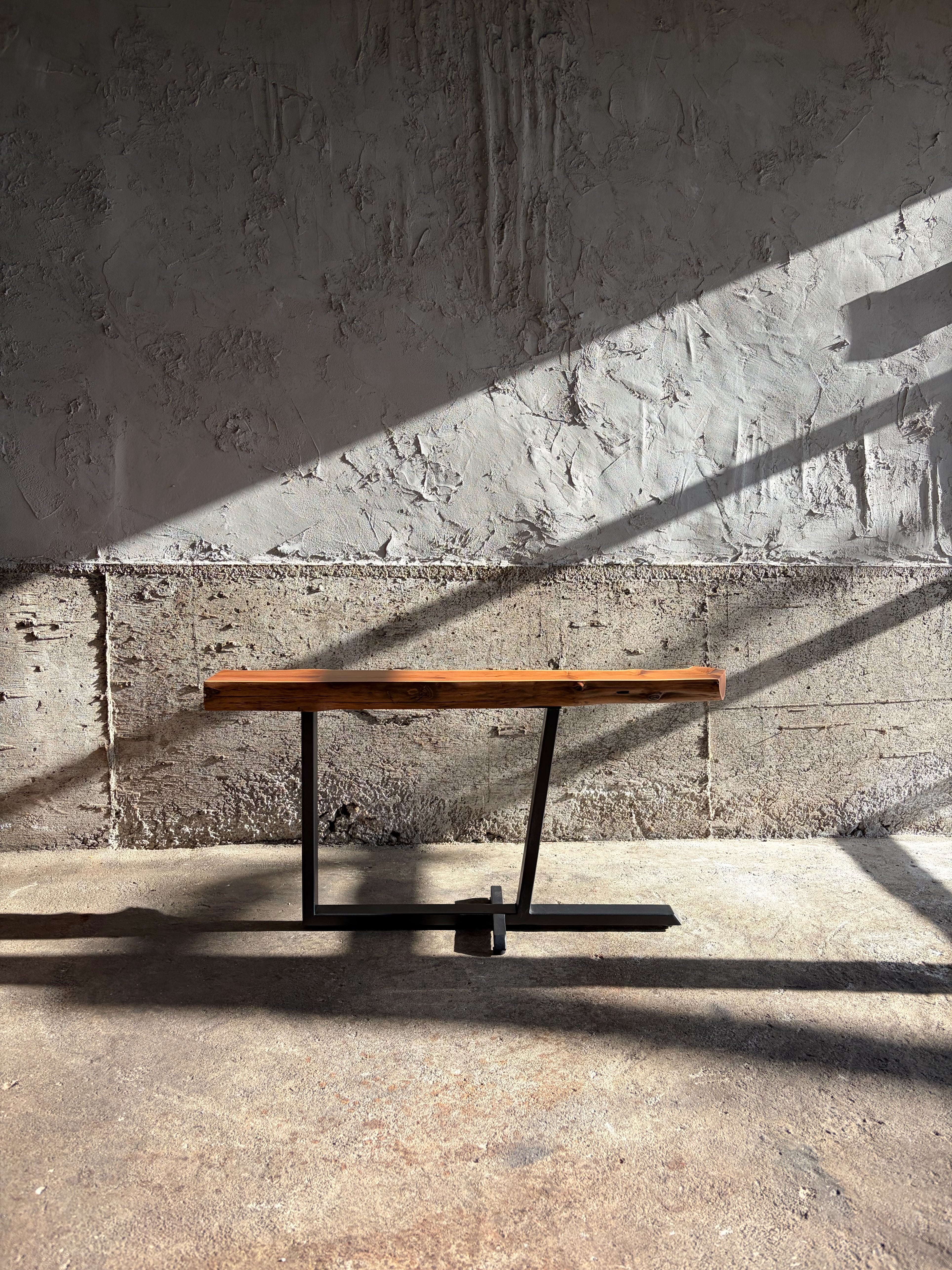 本作では天板に敢えて木の姿を残し左右非対称な鉄脚を合わせました。既製品には無い個性を持ち、同時に機能的な品物を作るよう心がけています。
